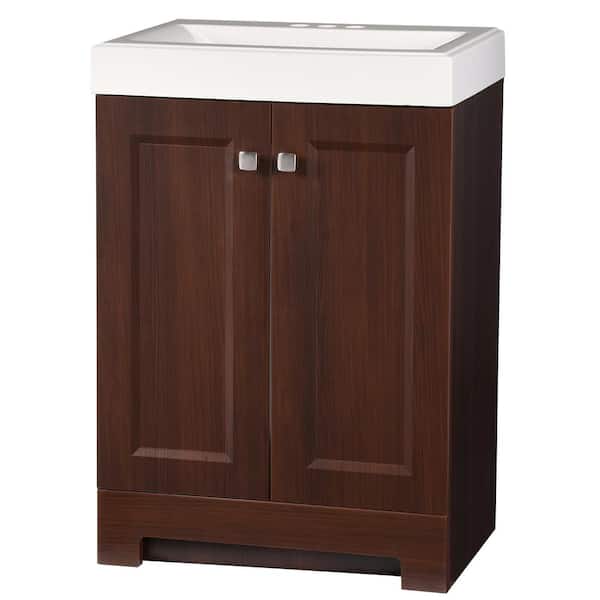 Forest elm cabinet finish with white cultured marble sink top complements any décor