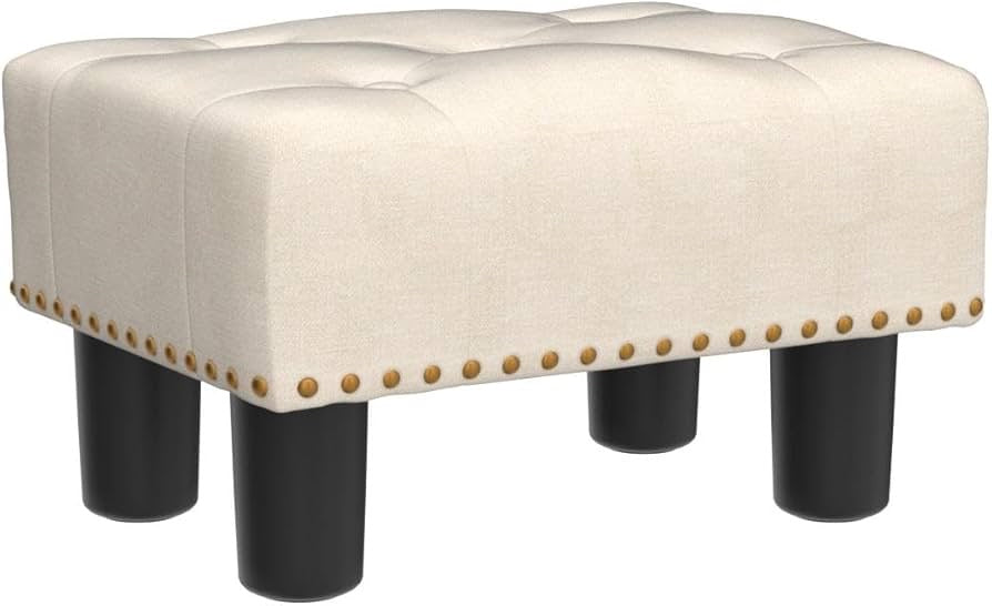 Small Tufted Foot Stool, Beige Linen Rivet Tufted Footrest with Plastic Legs, 9''H, Rectangle Foot Stools for Adult with Non-Slip Pads, Sofa Footstool for Living Room, Couch