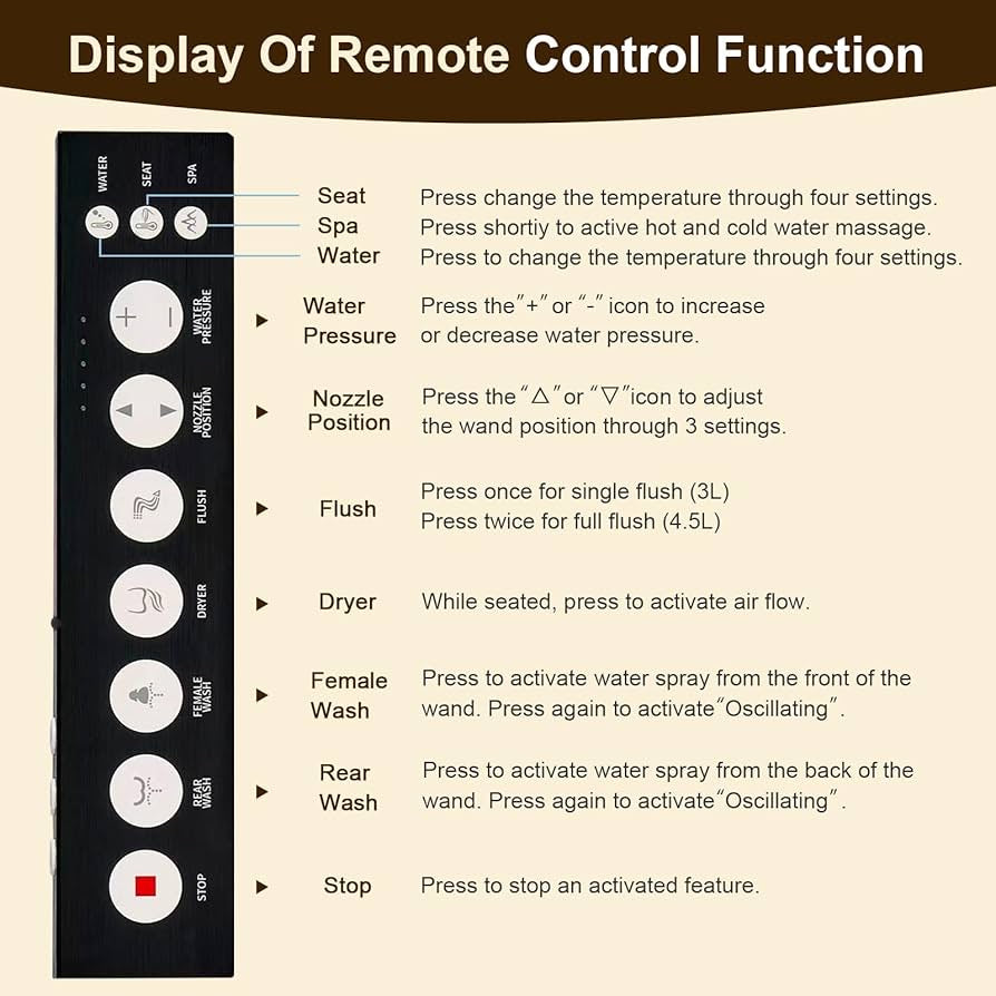 - [REMOTE CONTROL&SMART KNOB]: Remote control to operate all functions easily.Smart Knob for easy control,in the state of power failure, side knob of the bidet toilet can achieve flushing.