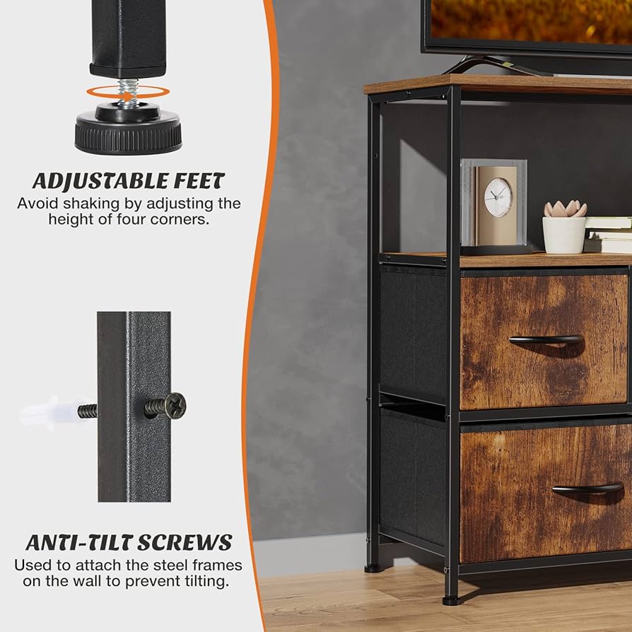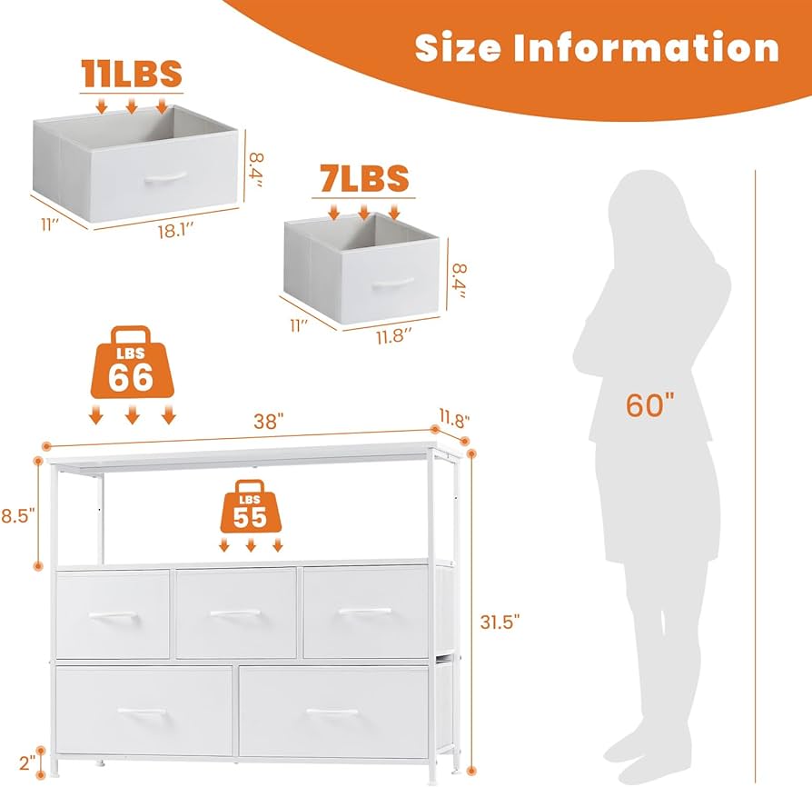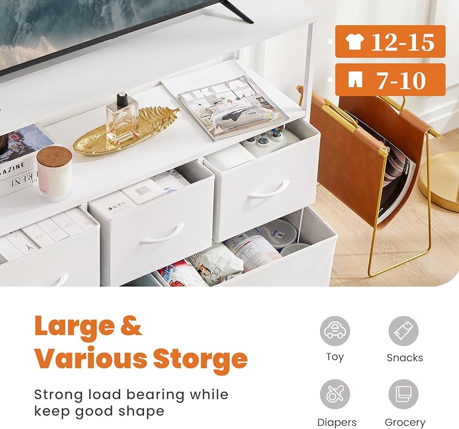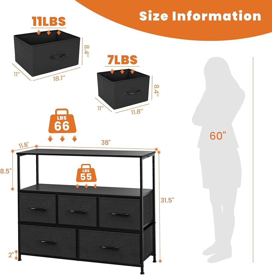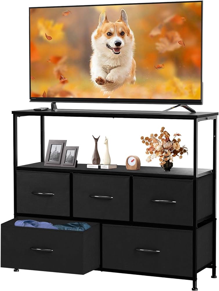 TV Stand for Bedroom, TV Dresser for 45 inches, Media Console Table, ETV Stand for Bedroom, TV Dresser for 45 inches, Media Console Table, Entertainment Center with 5 Fabric Drawers Cabinet and Open Storage Shelf Furniture Cabinet for Living Room, Hallway