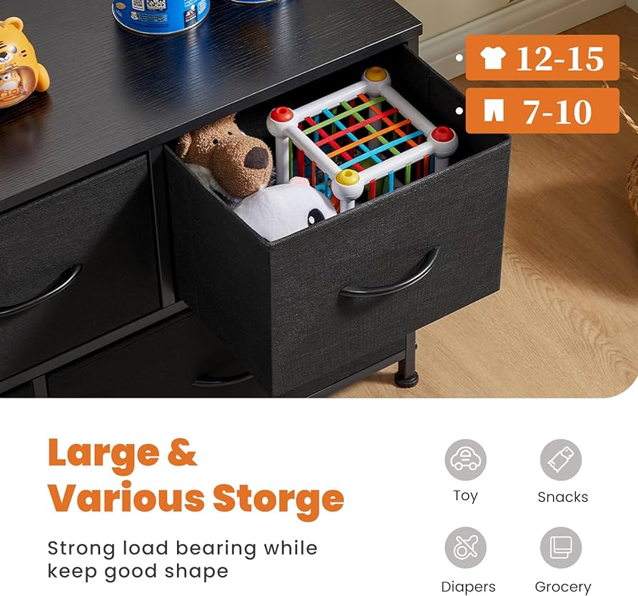 - 5 chests of drawers: 3 drawers on the upper level and 2 large drawers on the lower level. All fabric drawers are removable, and the power storage entertainment center capacity allows you to organize various items. The upper drawer can store your frequently used items, and the lower drawer can store various unused or infrequently used items to better organize your space.
