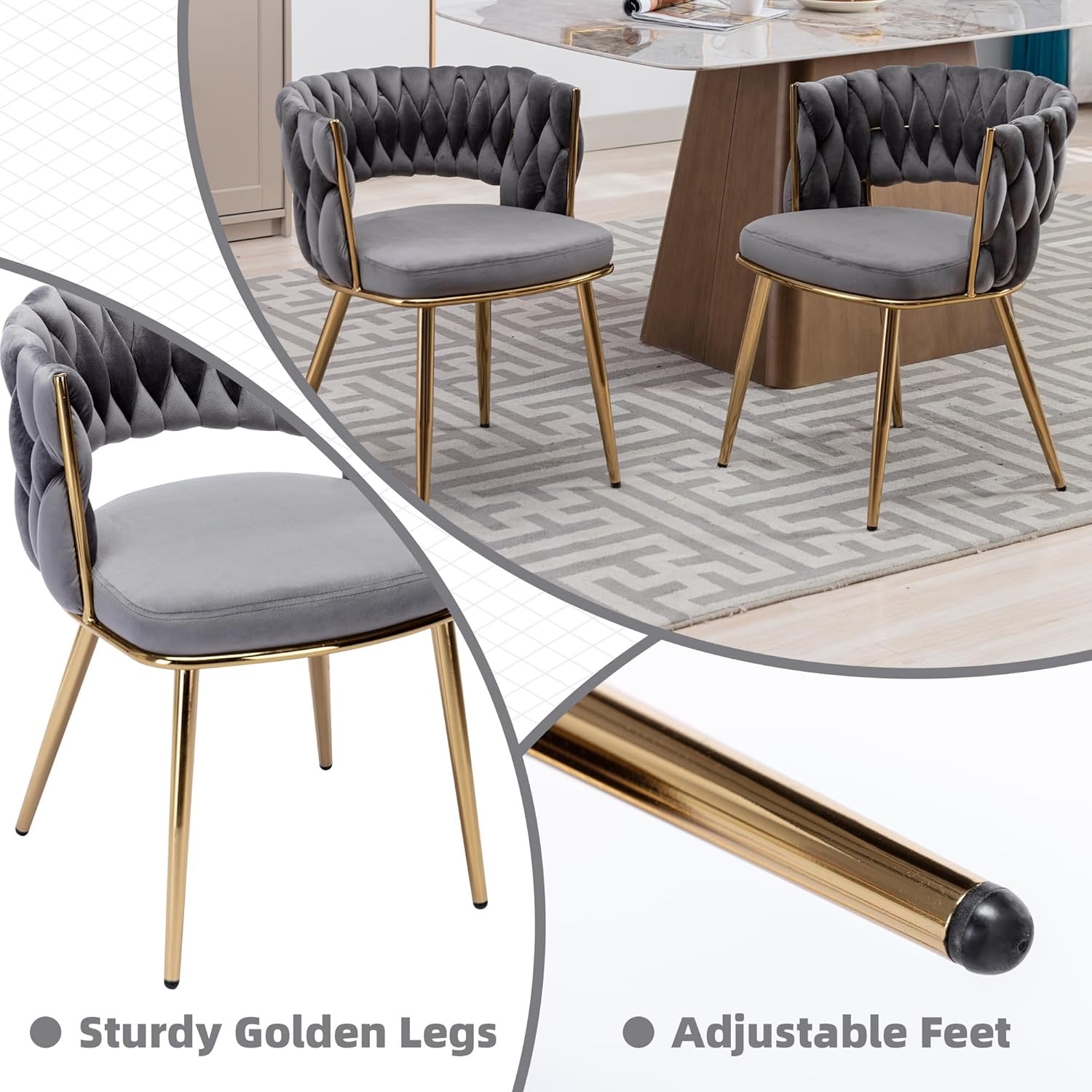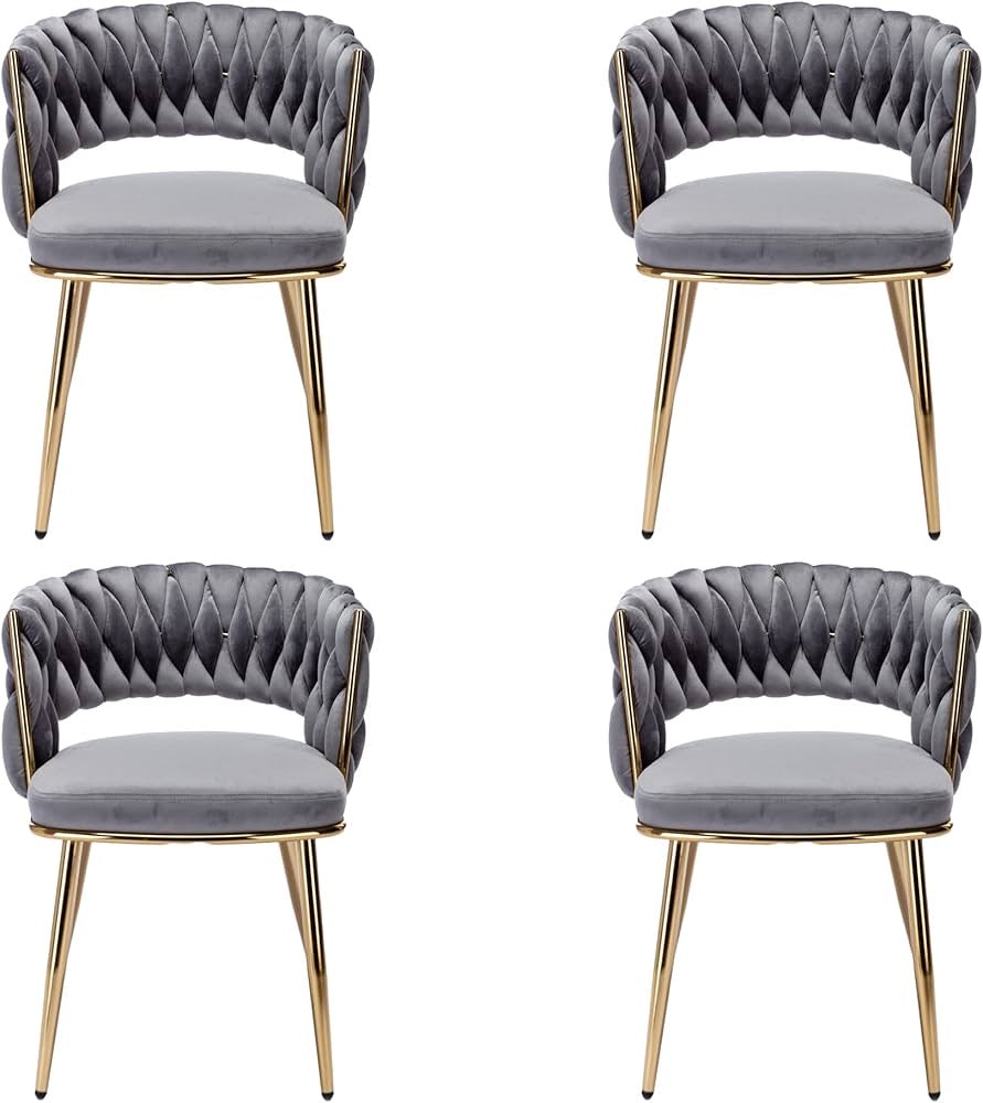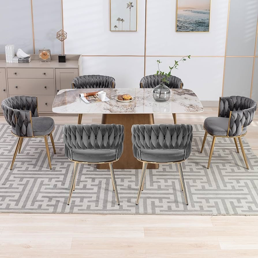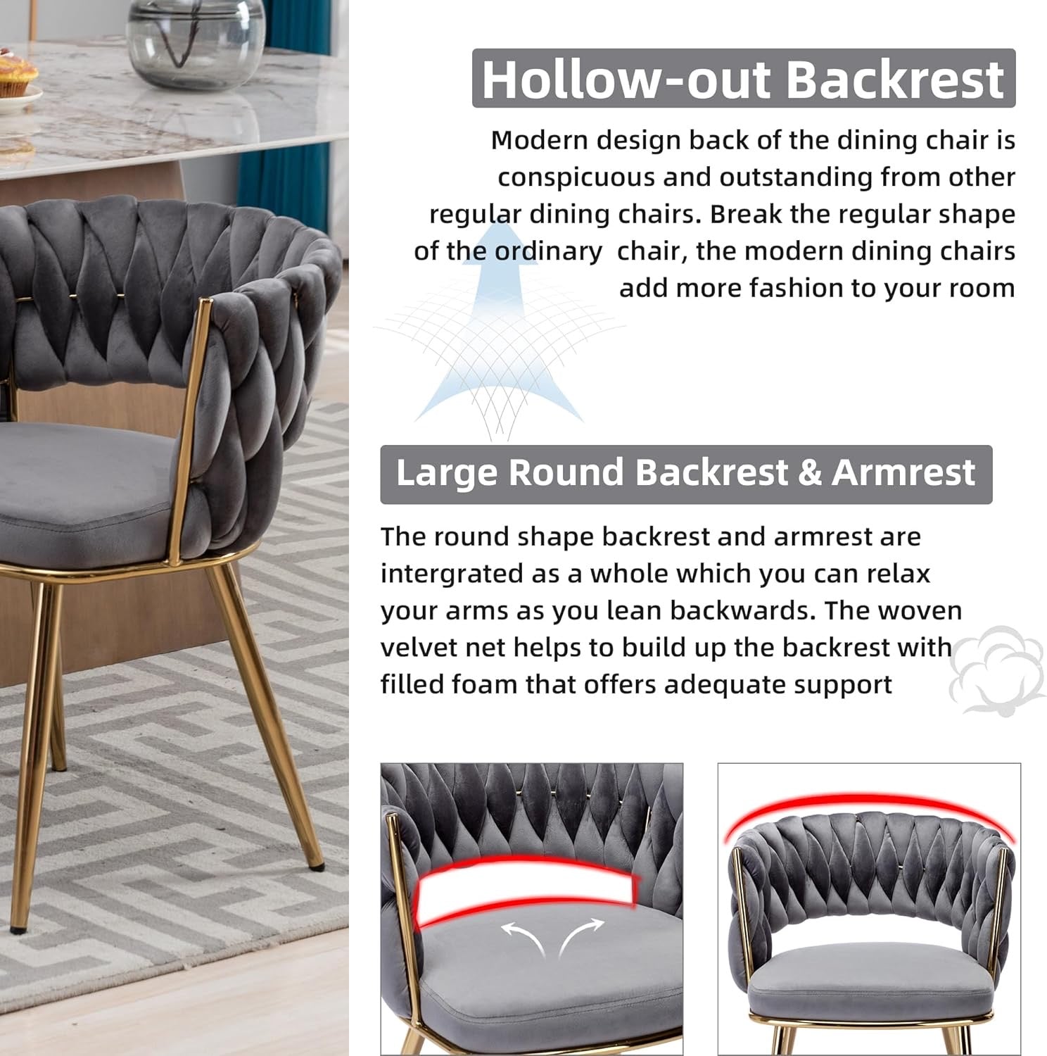 - Luxury Design Chairs: Abnegating the traditional shape of a dining chair, the outfit is newly designed with a woven and hollow-out backrest. With velvet covers the whole chair and legs are painted in gold, this modern chair does stand out from other chairs