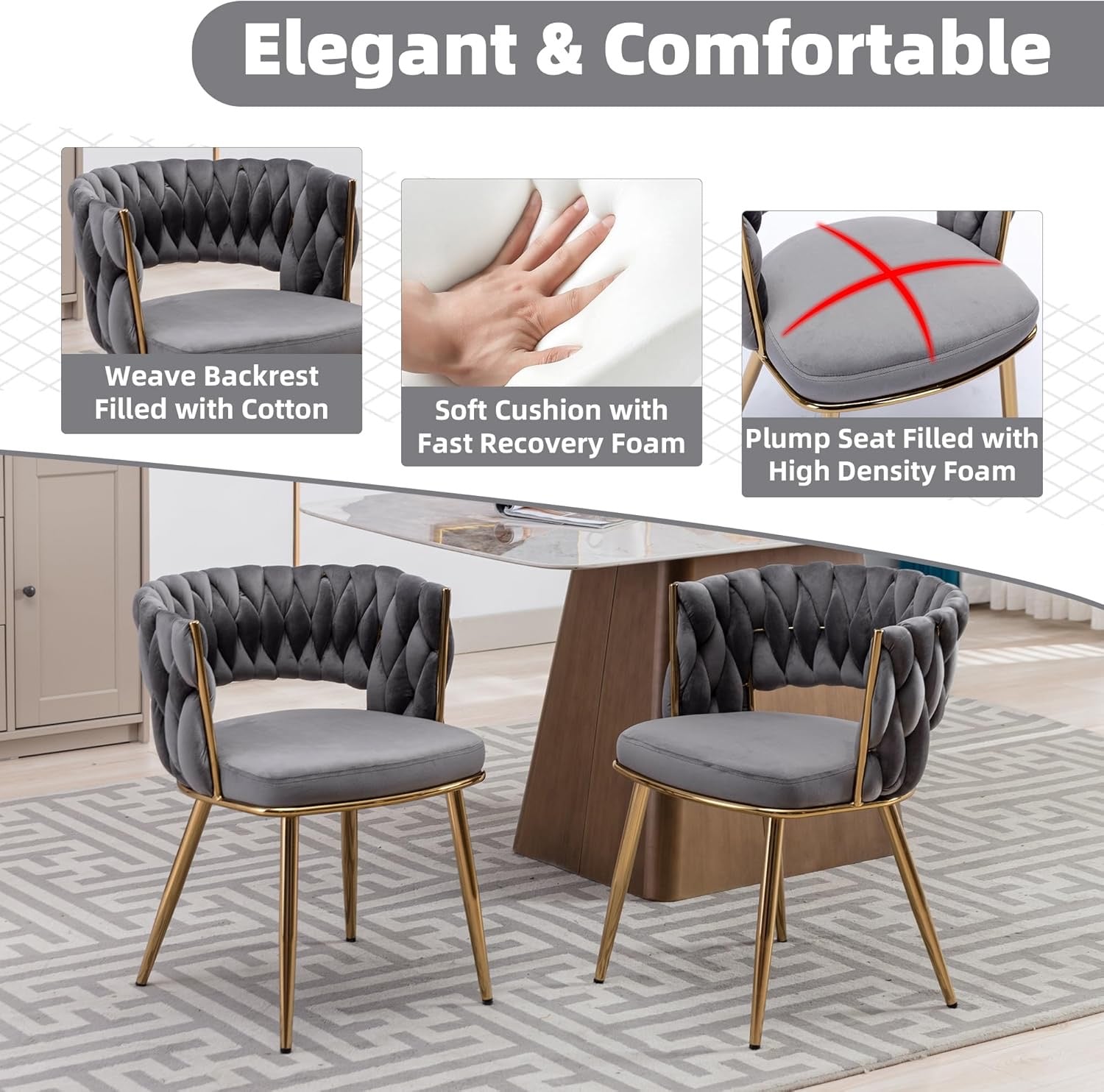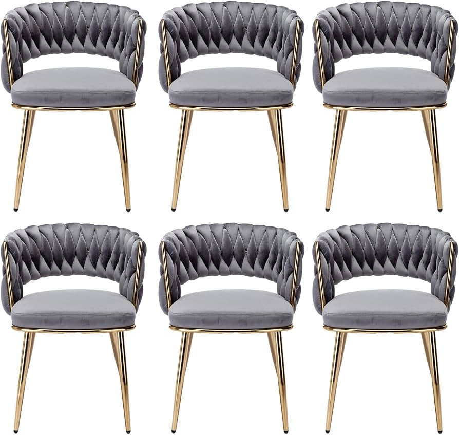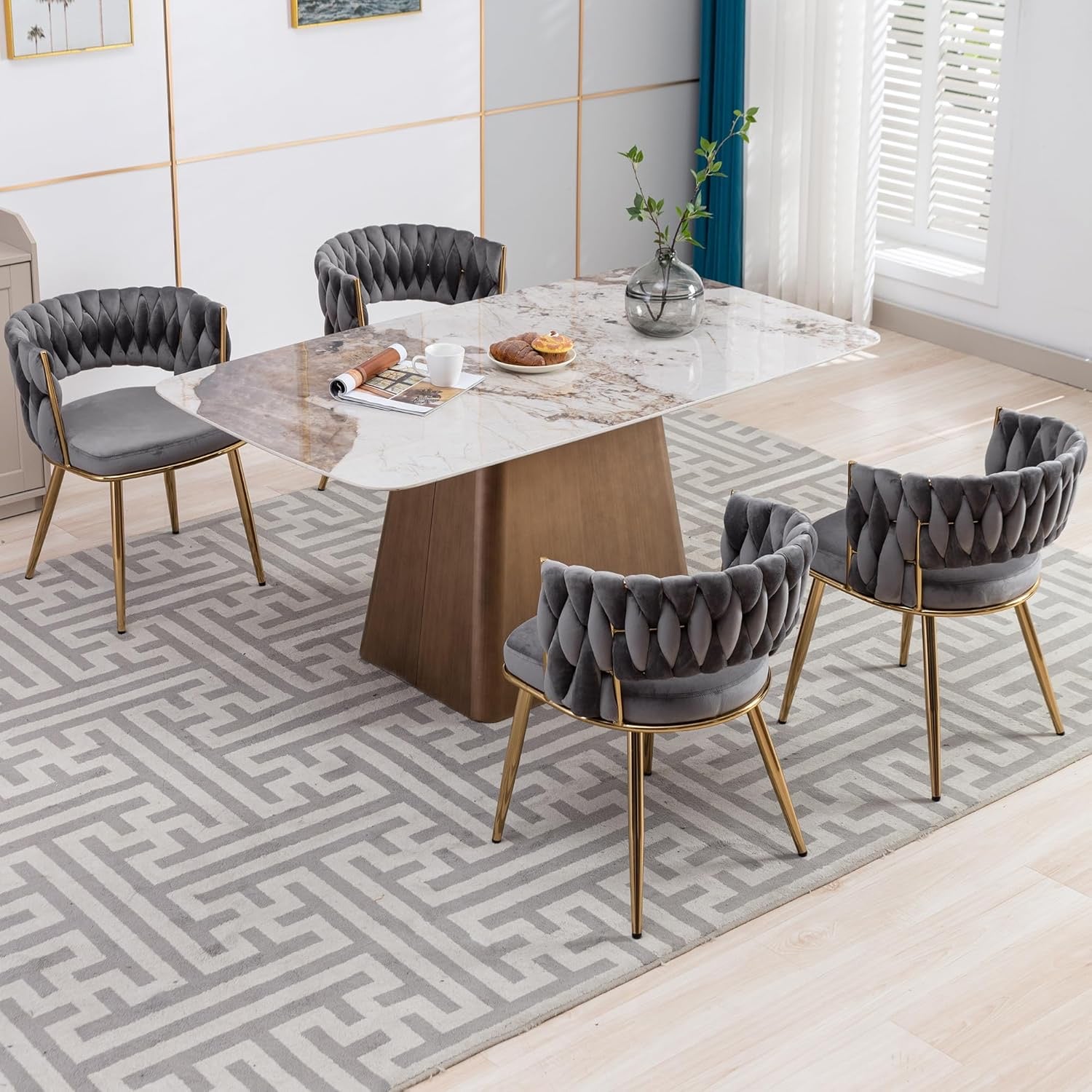 - Luxury Design Chairs: Abnegating the traditional shape of a dining chair, the outfit is newly designed with a woven and hollow-out backrest. With velvet covers the whole chair and legs are painted in gold, this modern chair does stand out from other chairs