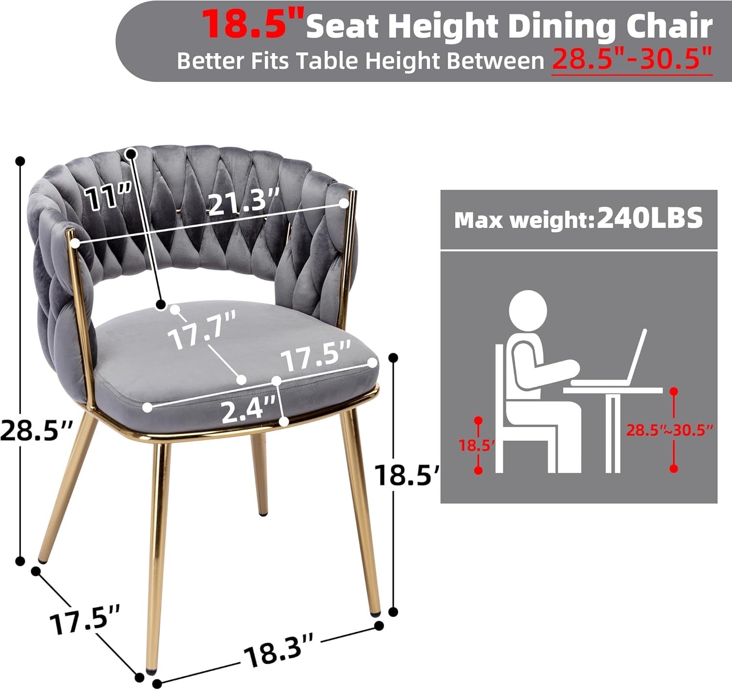 - Durable Quality: For longer service time, this dining chair is made of elastic metal. The weight capacity of it can reach up to 240 pounds which ensures a stable sitting. Also, the dining chair is equipped with rubber feet which avoid scratching your floor