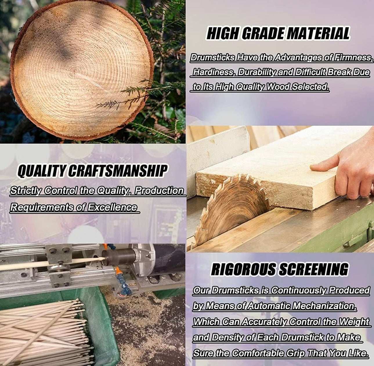 We select hard core as material for the drum and all the maple we choose is naturally air dried and each drumstick is carefully polished to ensure better quality for drummers.