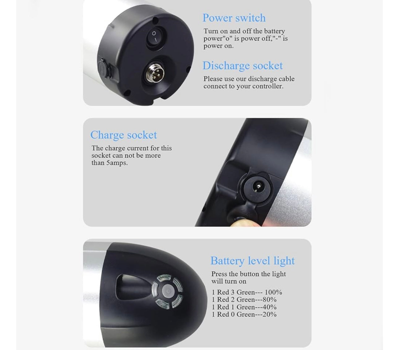 - 【Design Features】 The electric bike battery pack has a mounting bracket that will mount to most water bottle screw holes in the frame. It's easy to remove and charge at home or bike.Lock with keys securely, locks the mount on bike frame, prevents the battery from being stolen.With USB port can charge cell phone. With on/off button, save more power. Lighted battery LED power Indicator, inform you charge your battery on time.