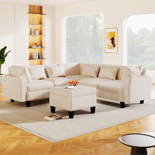87" Modern Linen L Shape Sectional Sofa with Coffee Table,Sectional Couch with Storage Ottoman